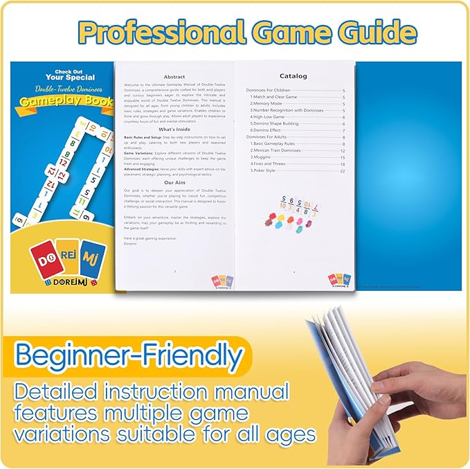 - Beginner-Friendly:Our Mexican train dominoes set includes Well-designed game manual to accommodate players of all ages and skill levels. With a variety of gameplay options clearly outlined, newcomers will find it easy to dive in, while experienced players can explore advanced strategies.Whether you’re playing dominoes with young kids or seasoned adults, everyone can discover a game style that resonates with them