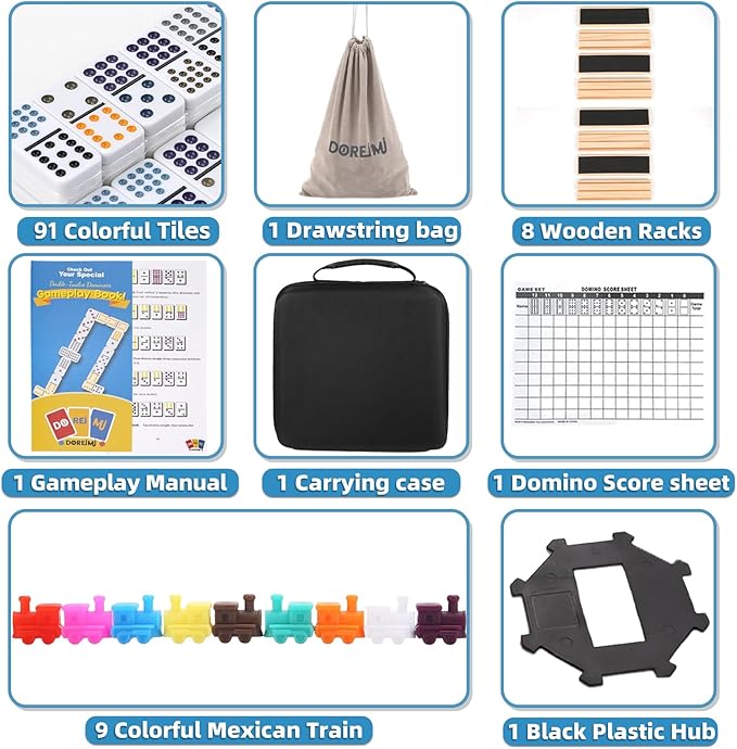 - Complete Mexican Dominoes Set:The double 12 dominoes Set includes all necessary components (91 dot domino tiles, 8 wooden trays, 1 portable storage case,1 drawstring bag,9 vibrant small trains, 1 game manual, 1 scoreboard, and 1 octagonal hub).Catering to various gameplay styles and occasions. Whether indoors or outdoors, with small or large groups, this versatile Mexican Train domino set is perfect for travel and outings.