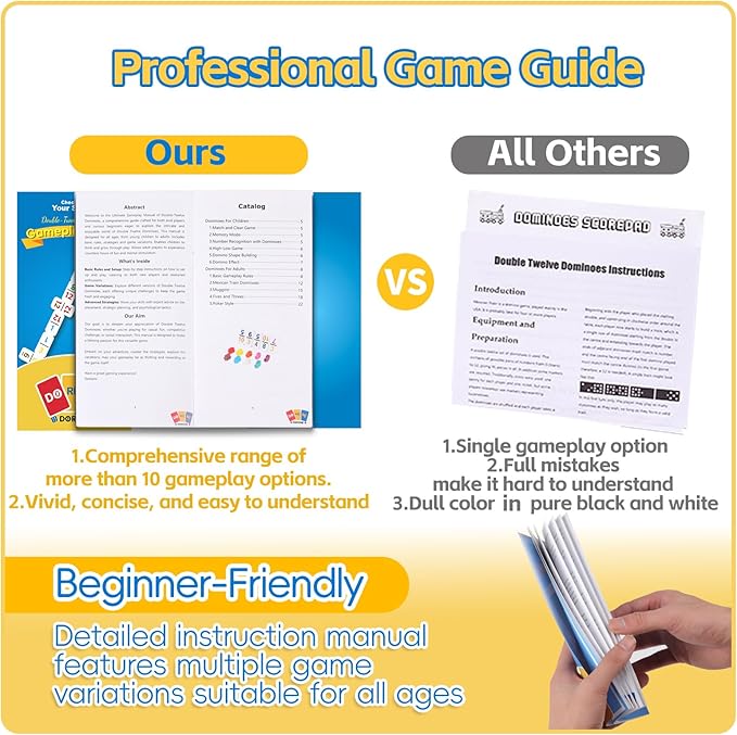 - Beginner-Friendly:Our Mexican train dominoes set includes Well-designed game manual to accommodate players of all ages and skill levels. With a variety of gameplay options clearly outlined, newcomers will find it easy to dive in, while experienced players can explore advanced strategies.Whether you’re playing dominoes with young kids or seasoned adults, everyone can discover a game style that resonates with them.