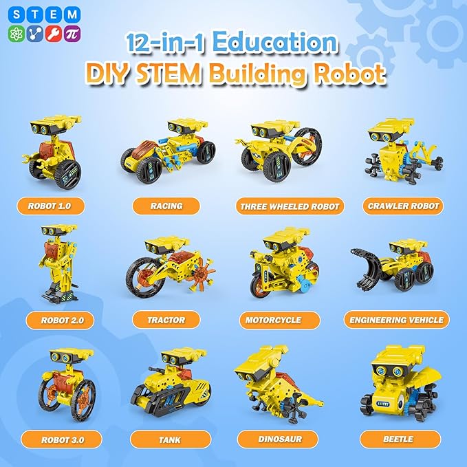 - 2024 Newest 12-in-1 Engineering Robot: 12 different building robots can play in any place, which can let 8-12 years olds learn about robot construction and various basic physics while playing and develop children's hands-on and imagination skills.