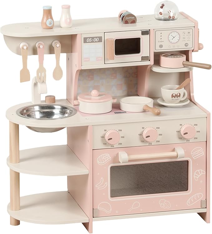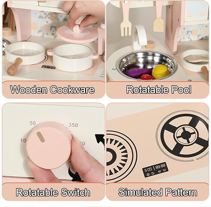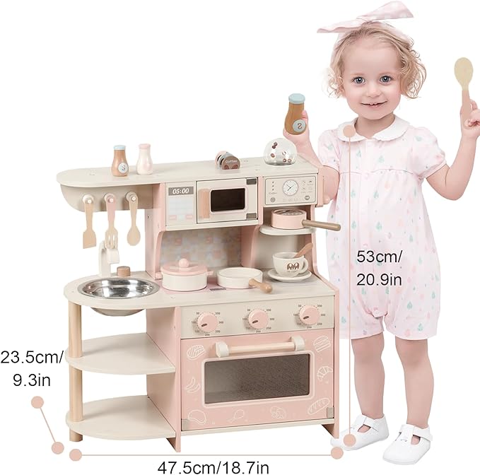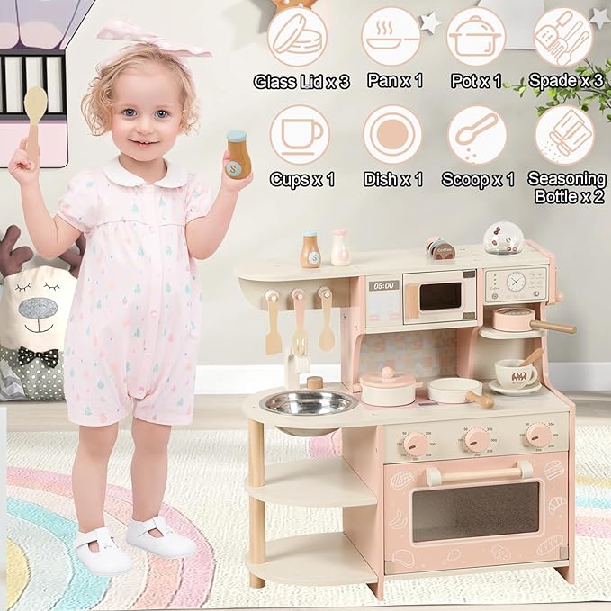 - 【Stable Design & High Quality】This play kitchen are made from safe wood with smooth surfaces and rounded edges, no burrs, and no smell, feature smooth edges to ensure children's safety.The stable design let the kitchen toy will not easy to shake or fall down. The toddler kitchen toys are also easy to install according to the install instruction manual.