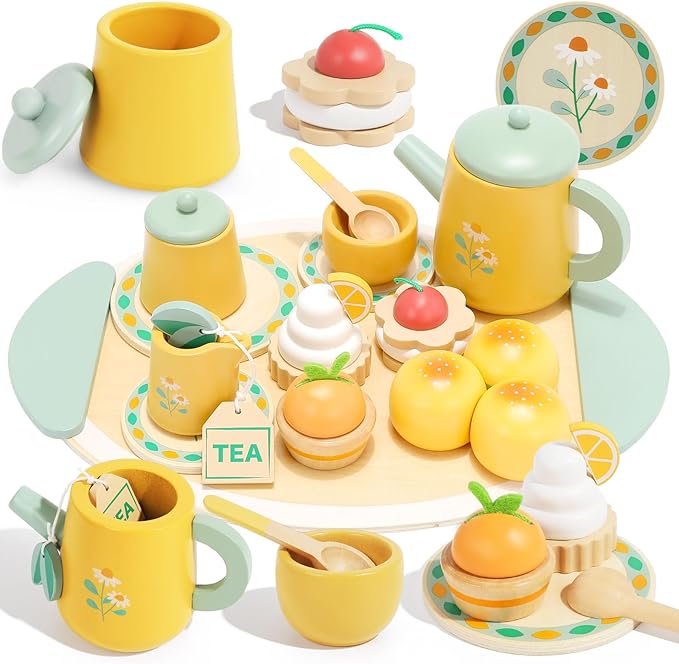 - 【Safe and Durable Design】Crafted from high-quality wood, this tea set is made to last with smooth edges and non-toxic paint. Perfectly safe for little hands, it ensures hours of tea party fun without worry. This toddler tea set is designed to be the ideal companion for screen-free imaginative play.