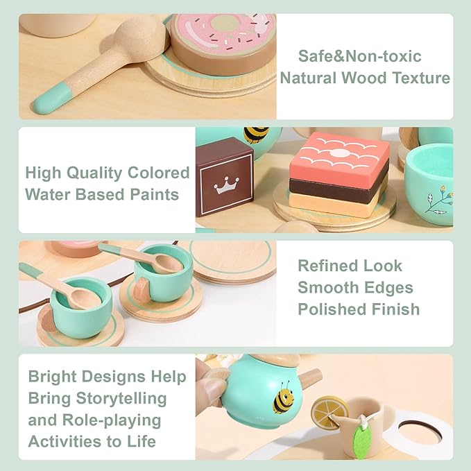 - 【Safe and Sturdy Design】Crafted from premium wood, this tea set features smooth edges and non-toxic paint, ensuring it's safe for little hands. Designed for durability, this toddler tea set promises hours of worry-free imaginative play, making it a perfect addition to any child's collection of wooden toys.