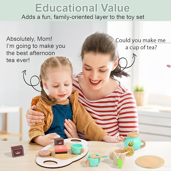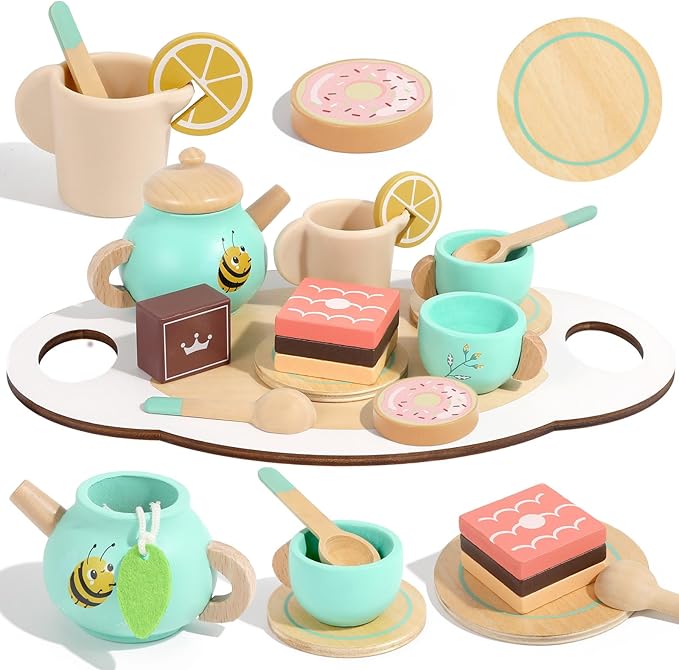 - 【Charming and Decorative】Designed with appealing soft colors, this wooden tea set is not just a toy but a charming addition to any playroom. Its delightful aesthetics make it a standout in pretend play for toddlers 3-5, while its robust design ensures it remains a favorite among little girl toys and tea party set collections.