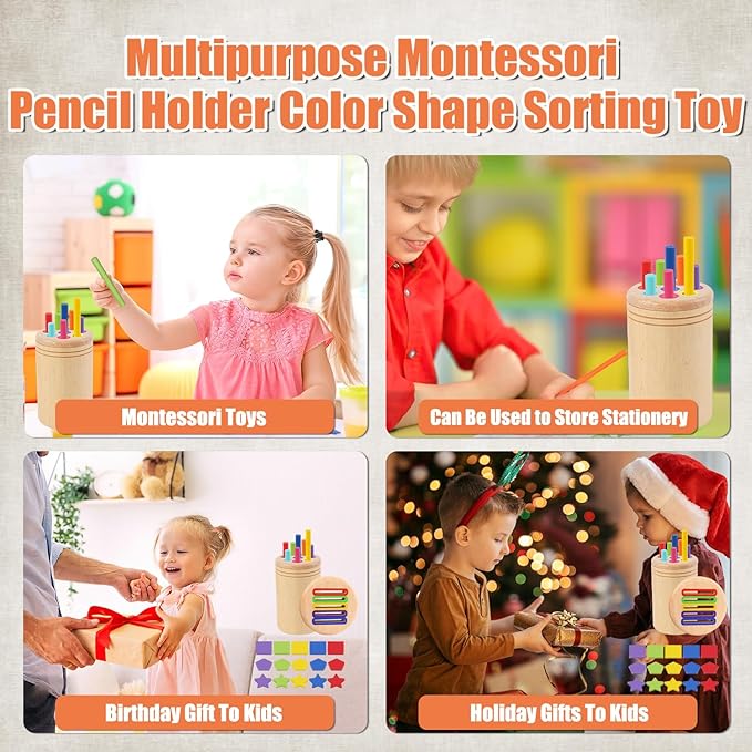 - Montessori toys for 3+ Years Old Toddlers: Our 35pcs wooden color sorting toy stacking set includes: a wooden pen holder sorter, 1 wooden stick color sorting lid, 1 wooden shape color sorting lid, 16 sticks (8 colors, 2 sticks of each color), 15 wooden multi-shaped wooden chips (5 colors, 3 chips of each color), and 1 reusable storage bag. It is very suitable for 4 5 years children who like to insert things into slots or holes, which can exercise their fine motor skills well