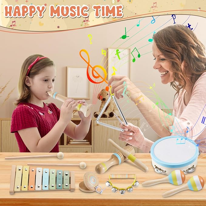 - 🎁【9PCS Toddler Musical Instruments 】This vibrant baby musical instruments set includes a variety of musical instruments perfect for kids, such as a xylophone, wooden sticks, tambourine, clarinet, hand bell, triangle, wood sounder, castanets, and maracas. These montessori musical toys provide everything your toddler needs to create beautiful melodies and explore different tones and rhythms, fostering creativity and imagination. It's an excellent educational toy for early childhood development.