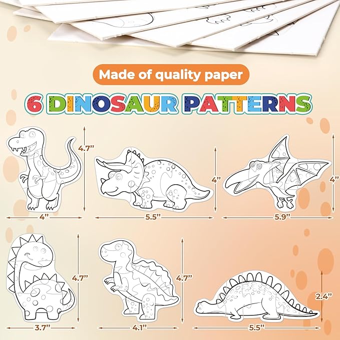 - Dinosaur Painting Craft: This STEAM toy for kids includes six dinosaur puzzles(Tyrannosaurus/Spinosaurus/Apatosaurus/Pterosaur/Stegosaurus/Triceratops). Each pattern has three or four puzzle pieces. This cute dino craft is made of quality paper. For dinosaur toy lovers, crafting personalized colors and using them to fill in the puzzles is sure to be fun and exciting!