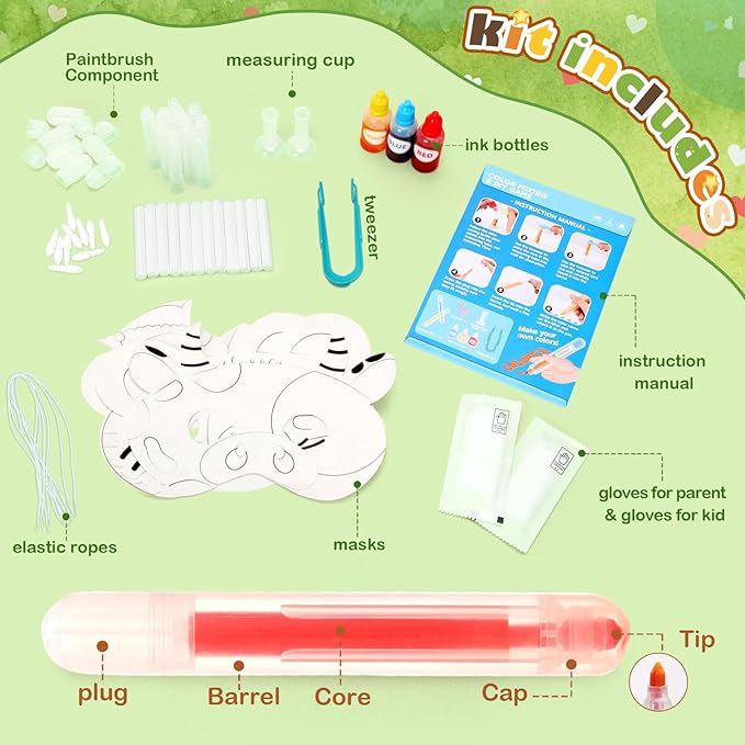 - A Complete STEM Toy Set: Package includes marker maker tools (three ink bottles, two measuring tubes, one tweezer), marker part set for twelve markers (barrels, cores, tips, caps, plugs, labels), six DIY masks, two pairs of gloves (one adult size and one child size), and an instruction.