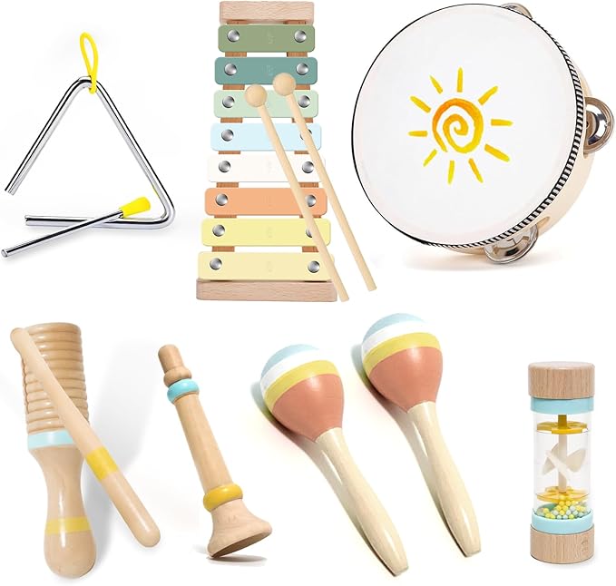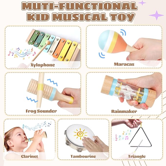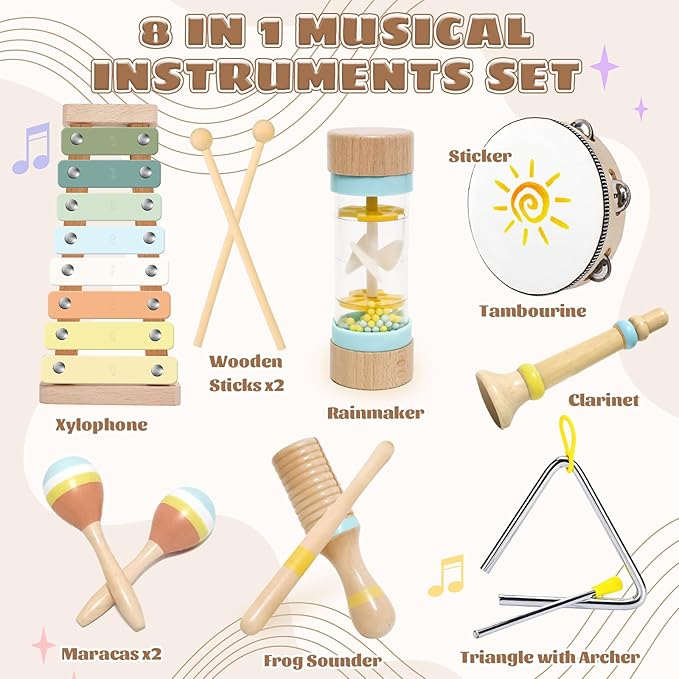 - 【All-In-One Musical Set】 This children's musical instrument set includes xylophone, triangle with archer, 2x maracas, tambourine, wooden sounder, clarinet, rainmaker, perfect for fostering creativity and musical exploration in toddlers aged 1-3 years old.