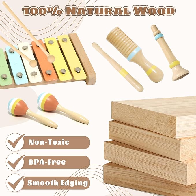 - 【Durable Construction】 Crafted with sturdy wooden frames and vibrant, non-toxic finishes, these toddler musical instruments are designed for enthusiastic play while prioritizing safety. Rounded edges and stylish neutral tones ensure they blend seamlessly with any playroom decor.