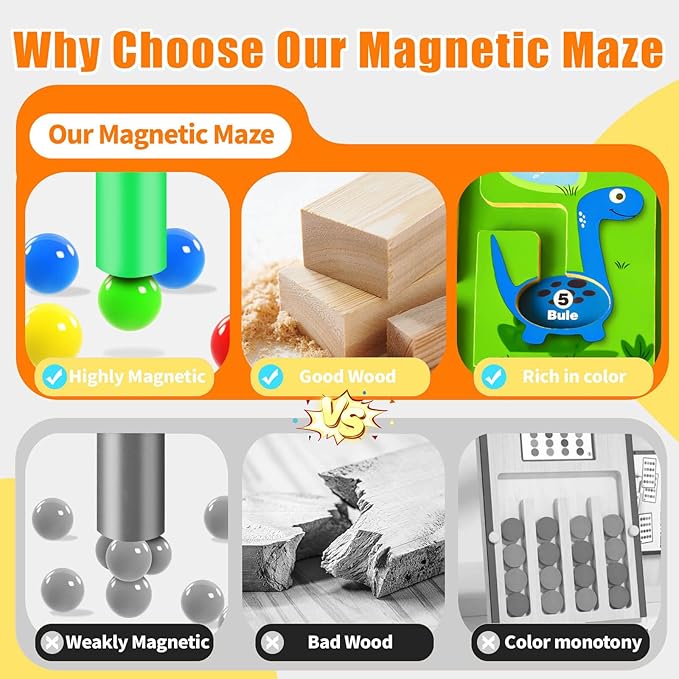 - Designed for Safe Play - This magnetic maze board is made of extra thick high quality natural wood and non-toxic water-based paint, with smooth edges and corners, secured with 8 nails to ensure sturdy and safe; the high quality acrylic board makes the board strong and durable, and the magnetic beads won't fall off, which won't cause harm to children.