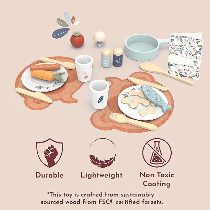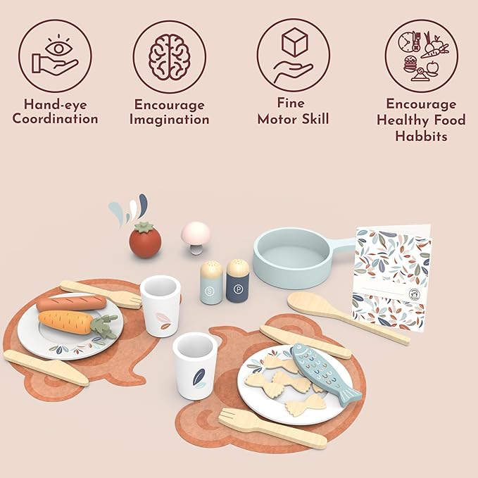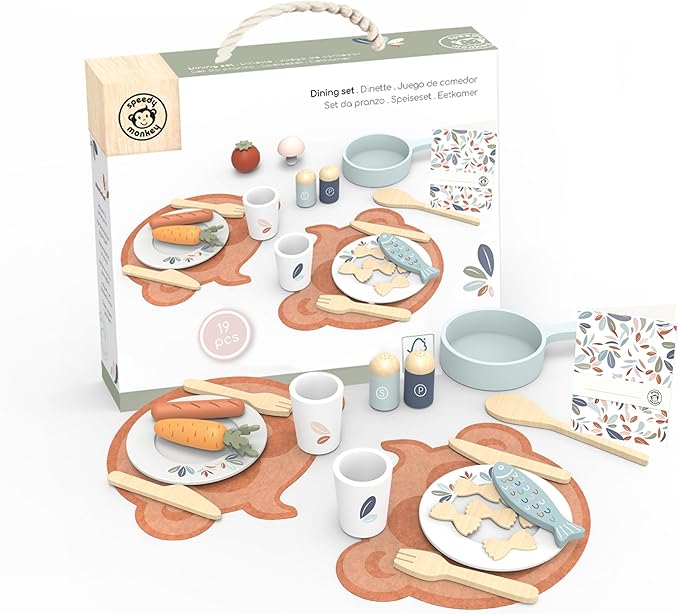 Speedy Monkey Wooden Dining Set for Two – 19-Piece Pretend Play Meal Kit with Pasta, Fish, Sausage, Vegetables, and More – for Kids 2yrs Up | Encourages Imagination, Role Play & Fine Motor Skills