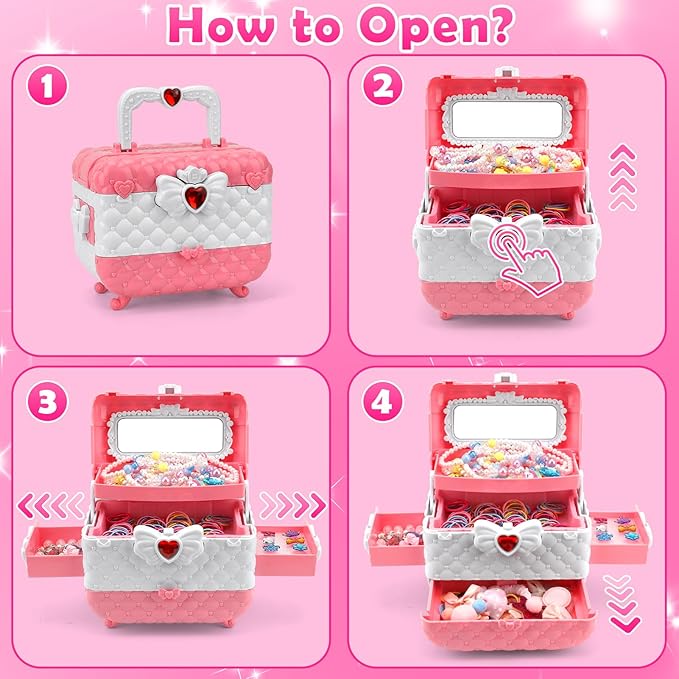 - Portable and Easy to Organize: The kids jewelry is designed for 3-12 year old girls. it has many compartments, when opened entirely, children can see all accessories, convenient for kids to use and cultivate a good habit of storage after dressing up. And it can be used for things such as carry case for other toys