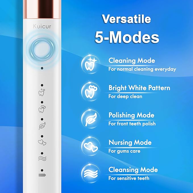 - 【Versatile 5-Mode Design】This electric toothbrush offers users an even more versatile and customizable cleaning experience.The 5 core modes allow users to precisely target their specific oral health requirements, whether it's thorough cleaning, whitening, gum care, or gentle sensitivity-focused brushing. This level of personalization further enhances the product's ability to deliver exceptional cleaning results tailored to individual user needs.