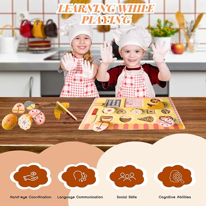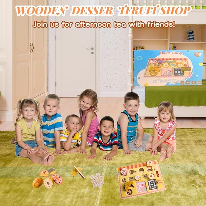 Wooden Play Food Set for Kids Kitchen,Kid Kitchen Accessories, Dessert Shop with Cutting Food Toys, Pretend Play Toy for Toddlers Boys and Girls,Aged 3 4 5 6