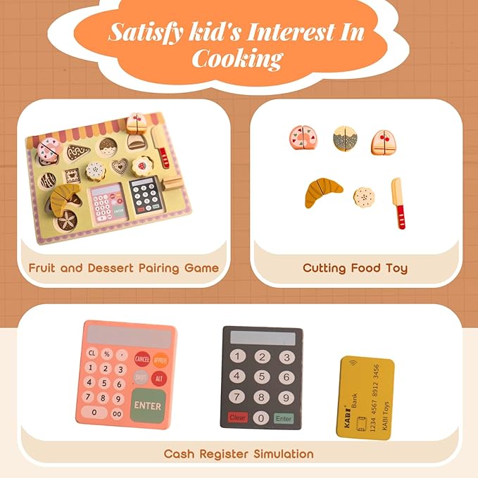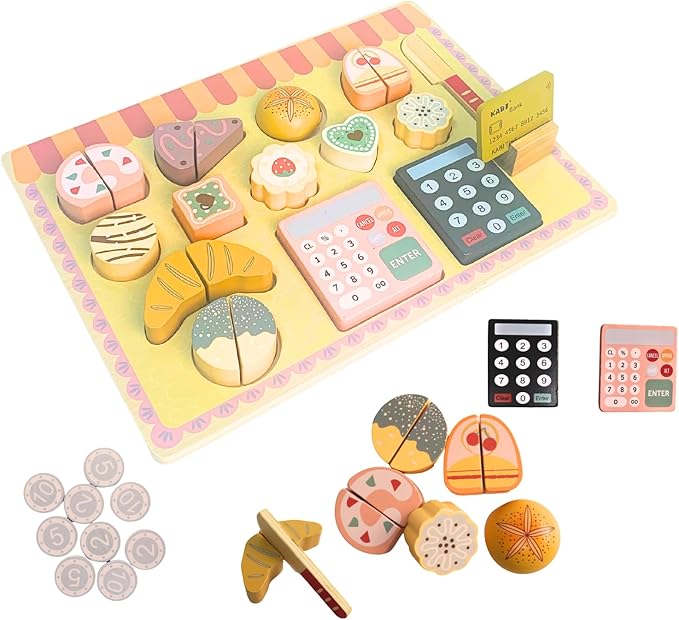 - Wooden Play Food Set: The dessert shop has 25 accessories, including 11 desserts, 1 knife, 1 wooden pallet, 2 wooden calculators, 1 wooden bank card, 1 POS machine, and 9 wooden coins. Besides, among the 11 dessert, there are 5 cutting toys