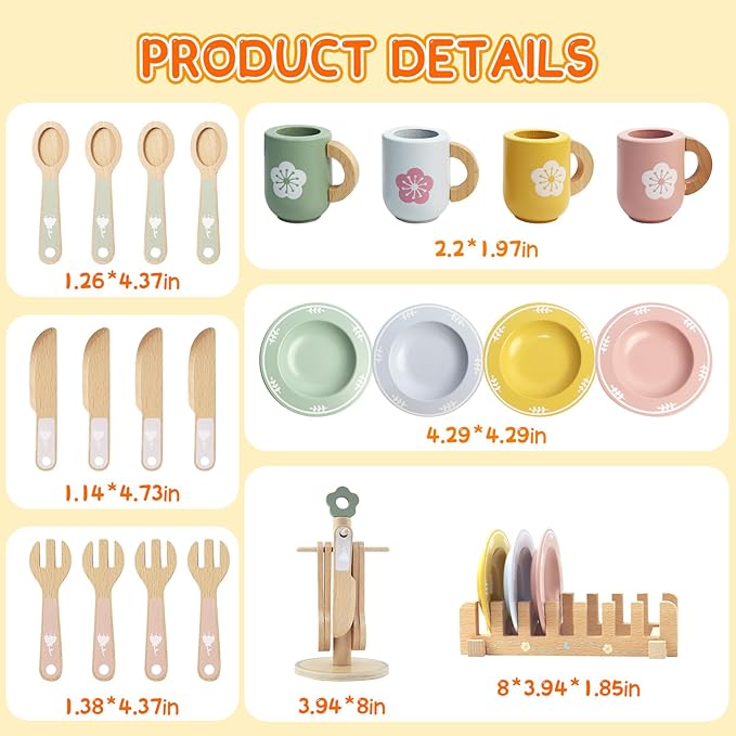 - Premium Materials: The play dishes for kids kitchen are crafted from high-quality wood, ensuring durability and sturdiness. The accessories are carefully sanded to ensure they are smooth and safe for little hands. The assembly is straightforward and can be easily completed