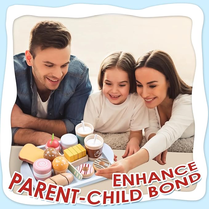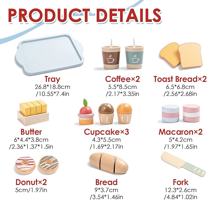 - Pretend Play Food Sets for Kids Kitchen: With the wooden food toys for toddlers 1-3, children can use a wooden knife to cut the bread, combined with desserts and coffee, a breakfast is ready. With various wooden play kitchen accessories, there are more combinations waiting for children to discover