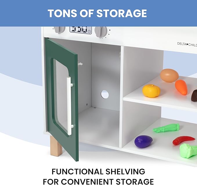 Delta Children Tiny Chef Play Kitchen - Toy Kitchen Playset with Realistic Knobs That Turn/Click, Oven, Sink, Microwave and 15 Pieces of Play Food, Green
