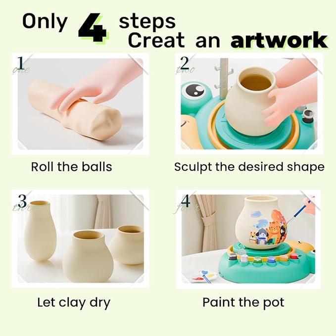 - All inclusive pottery kit. The set includes 1 pottery wheel kit, 1 apron, 2 clay knife &shaping tools, 2 painting brushes, 2 air dry clays, 6 paint colors and 1 USB charging cable. natural air drying without firing