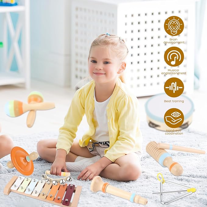 - 【Enchanting Musical Exploration】This delightful set of wooden musical instruments encourages children to explore sound and play. Featuring a xylophone, tambourine, maracas, hand drum, and more, each instrument offers a unique auditory experience that fosters a love for music in young learners.