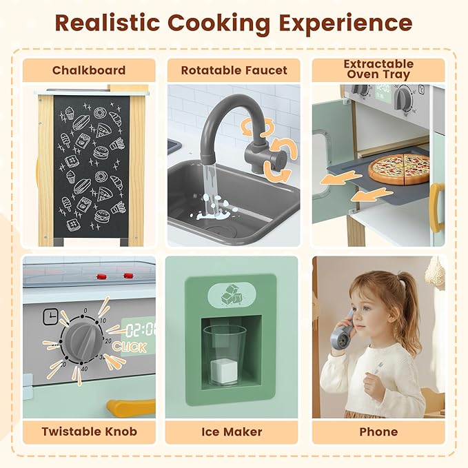 • 10-in-1 Playing Area with Fun: Includes range hood, oven, stove, microwave, coffee machine, sink with faucet, ice maker, chalkboard, clock, and phone. Ample storage space for easy cleanup.