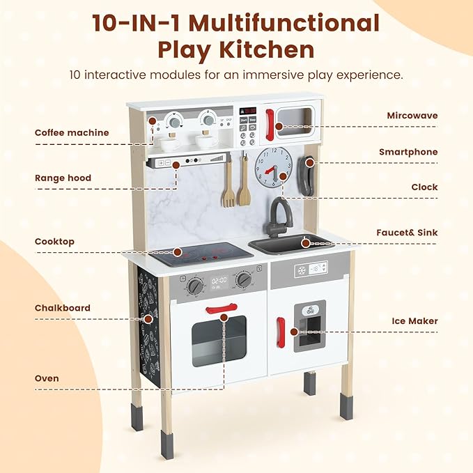 • 10-in-1 Playing Area with Fun: Includes range hood, oven, stove, microwave, coffee machine, sink with faucet, ice maker, chalkboard, clock, and phone. Ample storage space for easy cleanup.