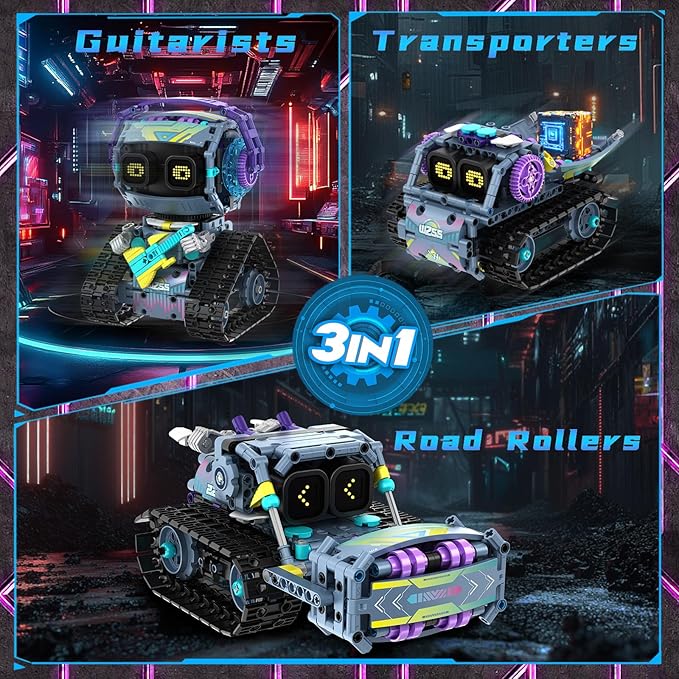 - STEM Building Robot Kit: This innovative STEM robot building kit is designed with LED dynamic eyes and interactive sound features, making it even more engaging for kids. The LED eyes change colors and patterns with a simple remote control command, adding an exciting visual element to the play experience. The kit allows children to build 3 different robot models: a guitarist robot , a rotating stunt dump truck robot, and a powerful road roller robot, offering a variety of play-and-learn experiences.