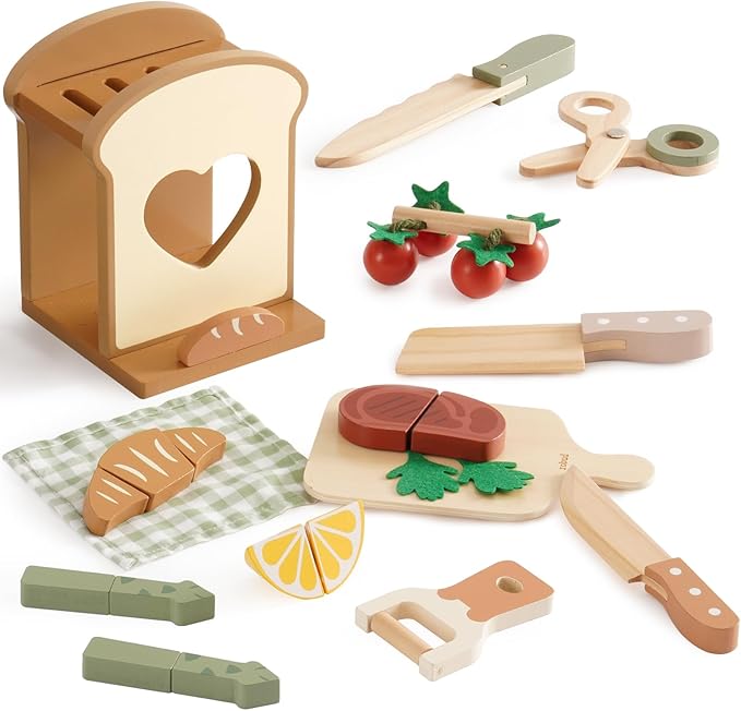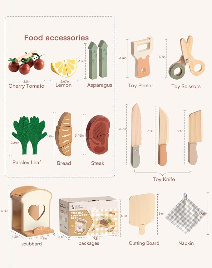 - Versatile Mocha Cookware Set: This wooden play food set features a "Mocha" theme, including a unique toast rack, cutting board, knife, and wooden food items like bread, steak. Perfect for toddlers to enjoy interactive pretend cooking and serving activities.
