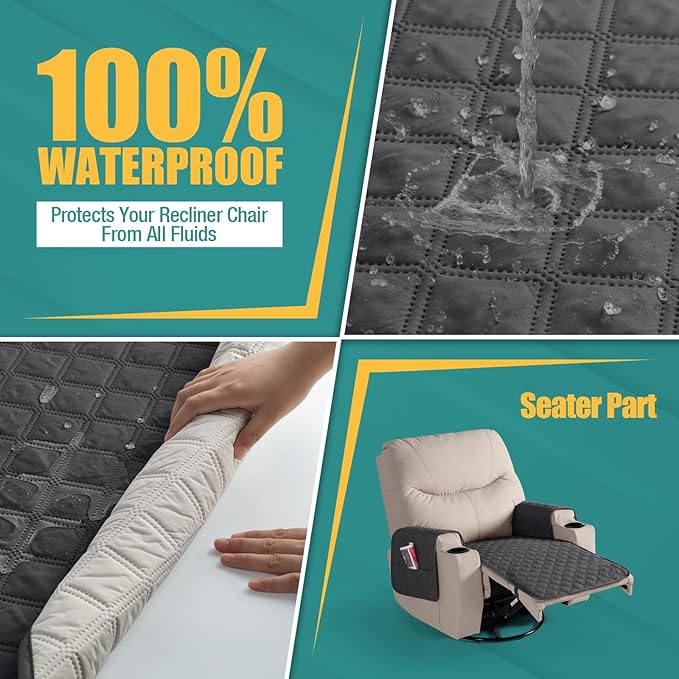 - 100% WATERPROOF: The waterproof recliner chair covers is made of a unique fabric and treated with a waterproof coating on top to prevent spills, accidents and leaks, making your recliner new and clean. Perfect for homes with pets and children