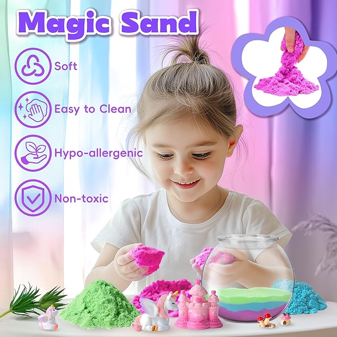 - Comprehensive DIY Kit: The unicorn terrarium kit includes everything needed to decorate and customize a unicorn-themed garden, from 3-color magic sand and preserved moss to LED night lights, clear acrylic jar, and various decorative accessories, allowing children to easily create their own magical world