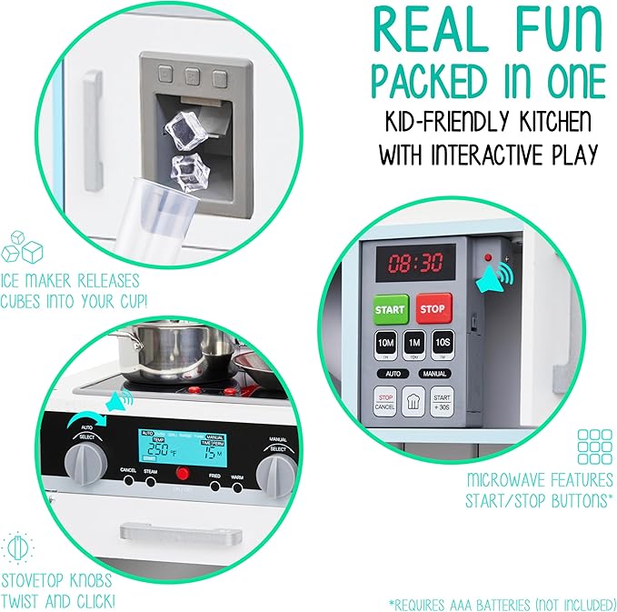 - SUPER REALISTIC SIGHTS & SOUNDS | Much More Than a Toy, Our Interactive Design Enables Meaningful STEM Kinesthetic Learning as Boys & Girls Immerse Themselves in a Real Kitchen Setup | Elements Include Battery-Operated Microwave, Oven, & Range w/ Light & Sound, Clicking Knobs, Ice Dispenser That Throughs Out Ice Cubes & Much More
