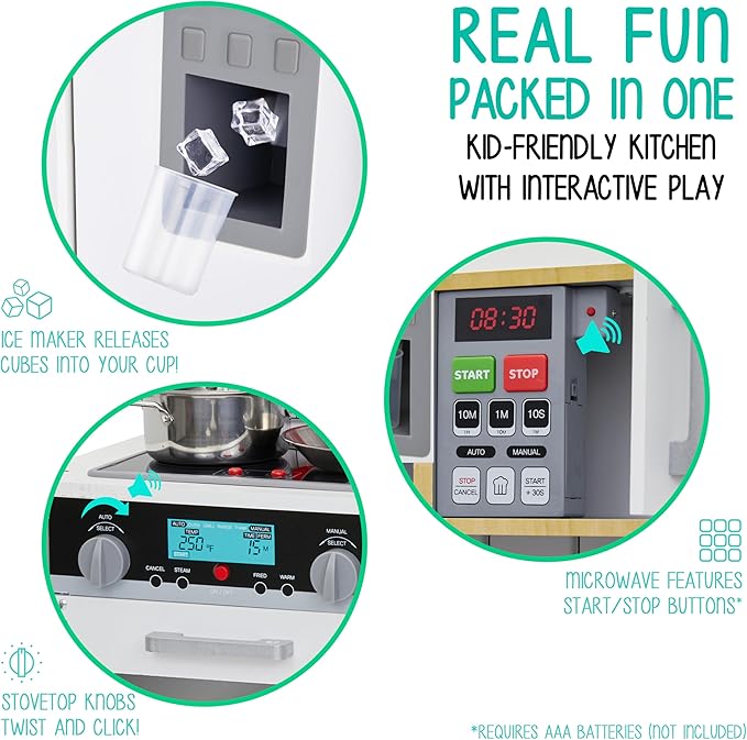 • SUPER REALISTIC SIGHTS & SOUNDS | Much More Than a Toy, Our Interactive Design Enables Meaningful STEM Kinesthetic Learning as Boys & Girls Immerse Themselves in a Real Kitchen Setup | Elements Include Battery-Operated Microwave, Oven, & Range w/ Light & Sound, Clicking Knobs, Ice Dispenser That Throughs Out Ice Cubes & Much More