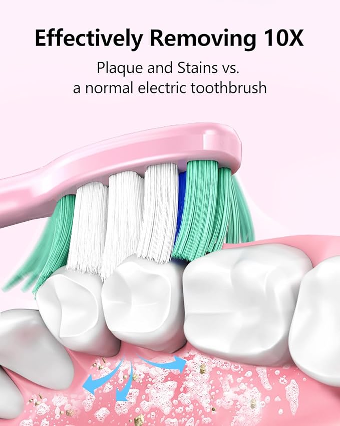 - All-New Upgraded Powerful Sonic Cleaning - Rtauys electric toothbrush features cutting-edge technology with up to 42,000 VPM high-frequency sonic vibrations, suitable for adults and kids aged 12 and above. It effectively cleans along the gum line, removing up to 125% more plaque and whitening teeth. It efficiently breaks down plaque and food residue. The soft, flexible bristles conform to the shape of each tooth surface, providing 4 times more surface contact and removing up to 10 times more plaque from hard-to-reach areas for deep cleaning