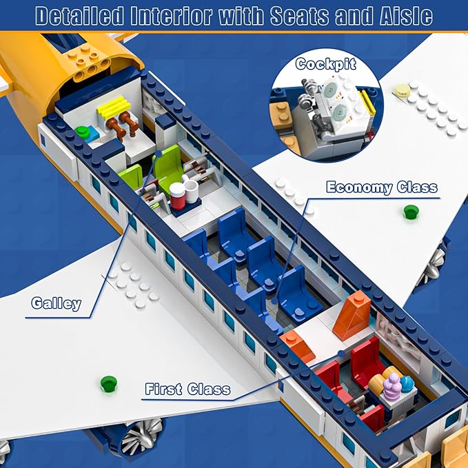 - 21-Inch Model Airplane and Ground Support Vehicles Building Toy Set for Kids --- Demkia airplane building block set includes a large city passenger airplane toy, a terminal with a radar tower, a luggage cart, a mobile stairway, and a baggage loader truck, offering a realistic airport experience. Kids can remove the aircraft’s roof to explore the detailed cockpit, seating area, aisle, restroom, and service area.