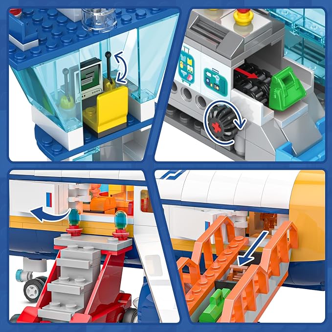 - Intricate Interior Details Bring the Airplane and Entire Aviation Center to Life --- The airport terminal features a gear-operated baggage conveyor belt, manually controlled by a side wheel to help suitcases move through security. Inside the aircraft, you'll discover a cockpit, first class, economy class, crew rest area, and restroom, complete with snacks, drinks, and a toilet, allowing kids to feel immersed in a real airport experience.