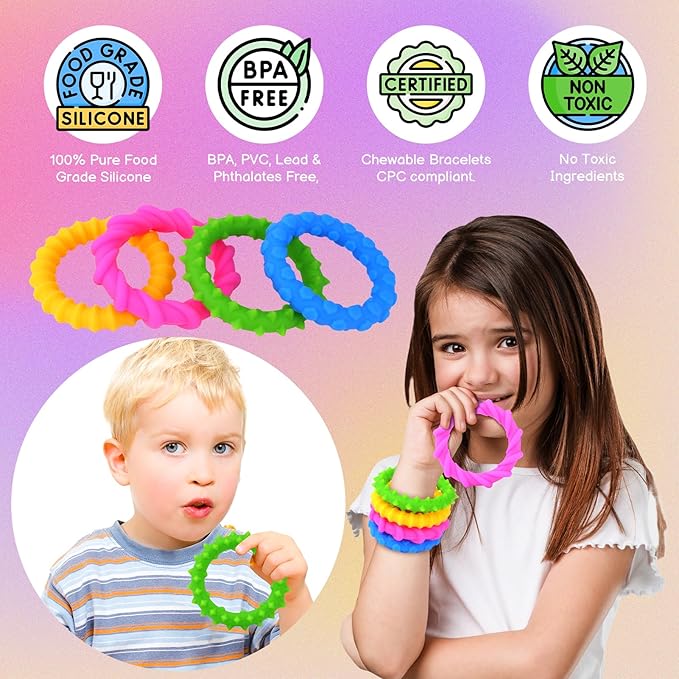 - SAFE MATERIAL - Crafted from 100% food-grade rubber, these chewable bracelets are BPA-free, phthalate-free, and lead-free. They are designed for light to moderate chewing. With a stylish design, fidget sensory anxiety toys double as accessories that kids can wear daily. They are gentle, safe, and perfectly sized for little wrists.
