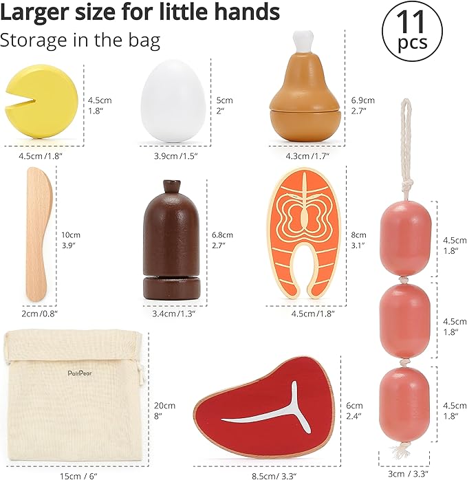 - Safety Pretend Play Food: PairPear wooden play food meat cutting toys are made of natural wood with colorful water-based painting. The self-stick tabs is easy to cut througth the toy food pieces and make a satisfying cutting sound. kids will prefer this challenge and enjoy the fun a lot