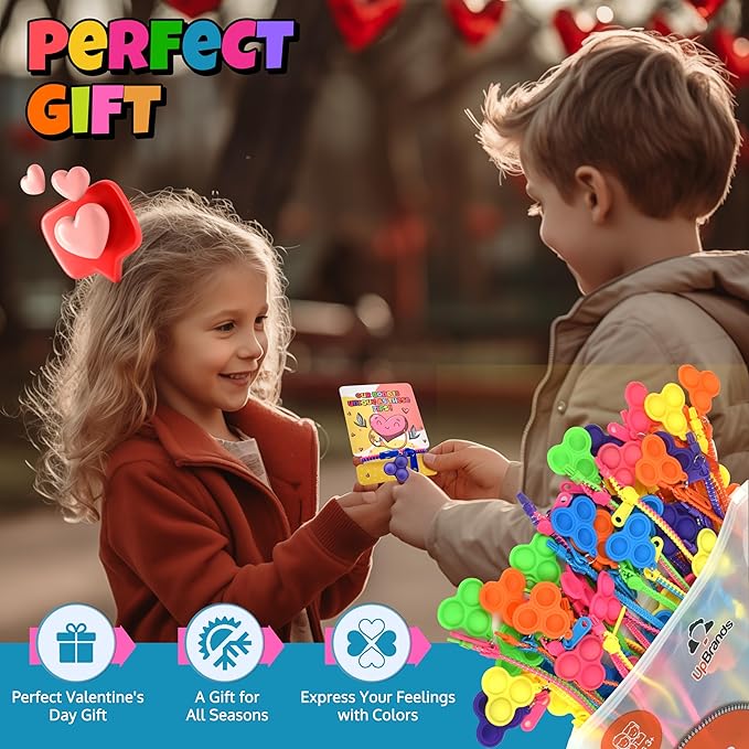 UpBrands 48-Pack Popit Zipper Bracelets with Valentine Day Cards - Perfect Sensory Gifts for Classroom Exchanges and Kids’ Joyful Moments