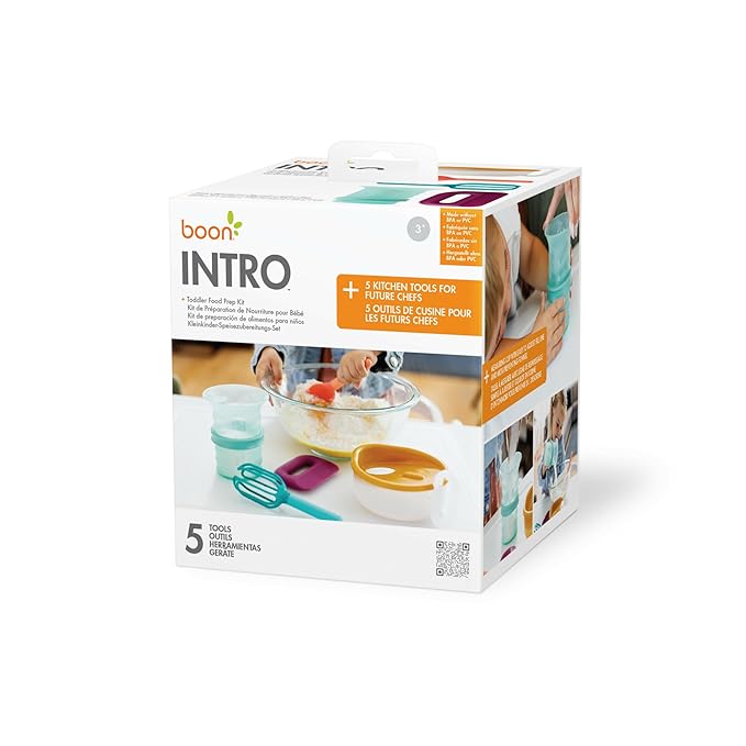 Boon Intro Toddler Food Prep Kids Kitchen Set - Kids Kitchen Accessories - 5 Unique Toddler Kitchen Tools Includes Spatula, Egg Cracker, Kids Chopper, Measuring Cup, and Bowl - Ages 3 Years and Up