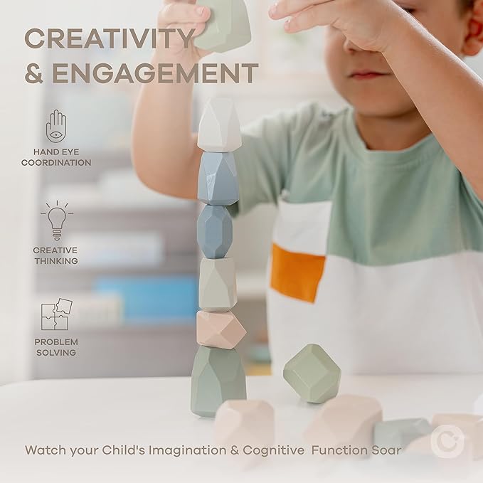 - Watch your Child's Imagination Soar: See the joy and wonder in their eyes as they build, create, and explore with 36 colorful wooden stacking rocks. Comfy Cubs toy rocks are designed to stimulate their creativity and enhance their playtime experiences.