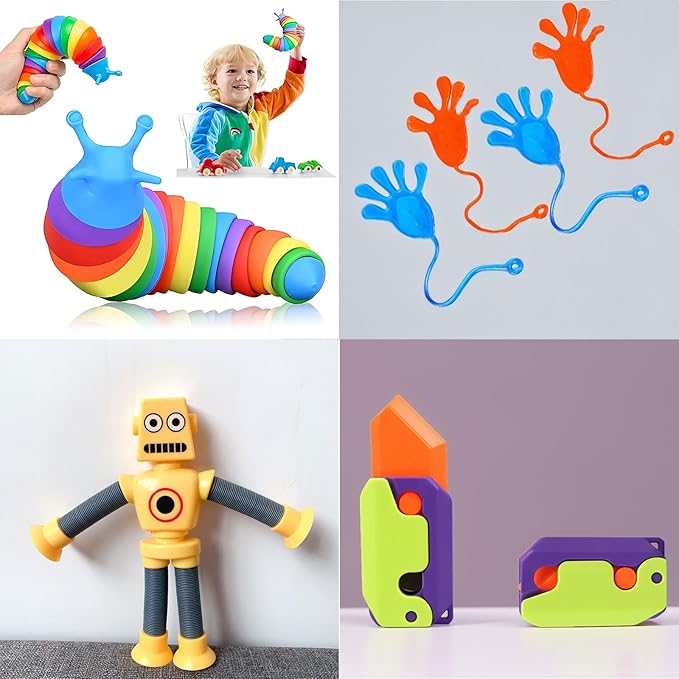 - 【2024 Upgraded Bulk 80pcs Fidget Toy Pack】8 * Stretch Tube for Kid,2 * Push Bubble,1 *Mini Push Bubble,4 * Puzzle Balls,4 * Mesh and Marble,2 * Pop Bracelet,1 * Rainbow ball,1 * Speed Cube,3 * Animal Stretchy Strings,5 * Mochi Squishy Toy,4 * Finger Rings,2 * Wacky Tracks,8 * Stretchy Strings,2 * Snake Cube Twist Puzzles,10 * Mini Plush Massage balls,1 * 3D Maze Puzzle,1 * Robotics Fidget Tubes, 4 * Cute Stickers,1 * 3D Fidget Slug,2 * Sticky Hands,2*3D Printing Fidget Knife Toys,etc