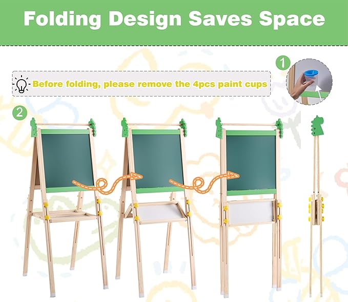 - 【Ample storage space and foldable design】This thoughtfully designed easel boasts a spacious, easy-to-clean plastic tray, ideal for storing brushes, markers, crayons, and various other art supplies. Furthermore, a large-capacity storage basket underneath ensures quick and convenient access to all your essentials. Additionally, its foldable design allows for space-saving storage when not in use. (Note: Kindly remove the four paint cans prior to folding.)