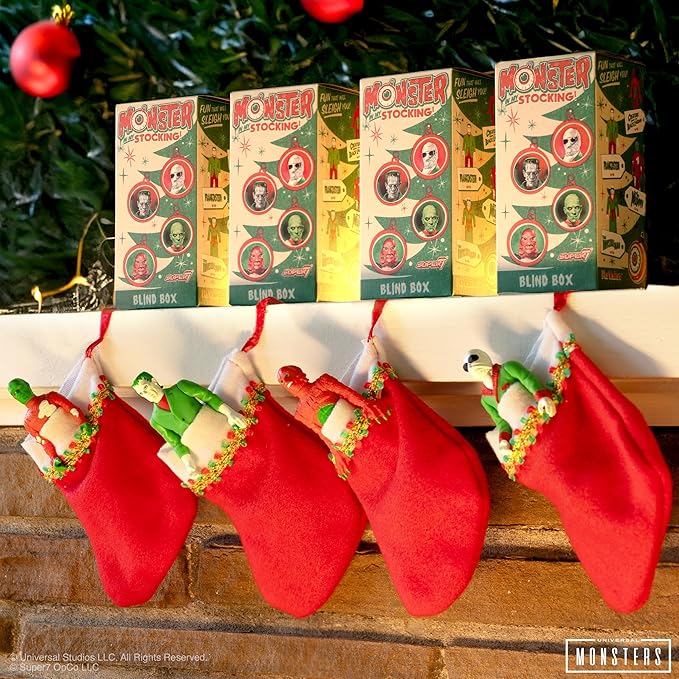 - 12-FIGURE SET: This action figure set includes four Creature from the Black Lagoon, three Frankenstein, three Mummy, and two Invisible Man figures, all in festive red and green colorways and blind box packaging