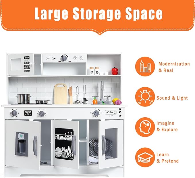 Wooden Play Kitchen Set, Kitchen Playset with Cookware Accessories, Microwave, Oven, Sink, Real Lights & Sounds - Perfect for Chef Pretend Play