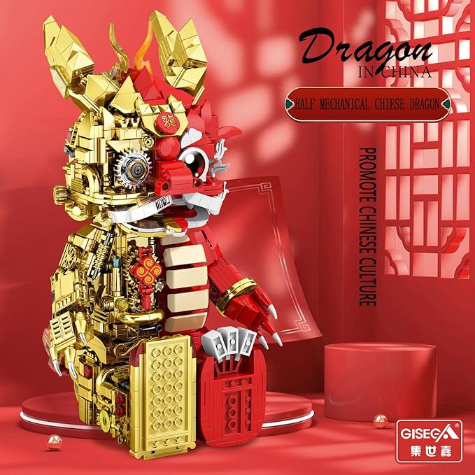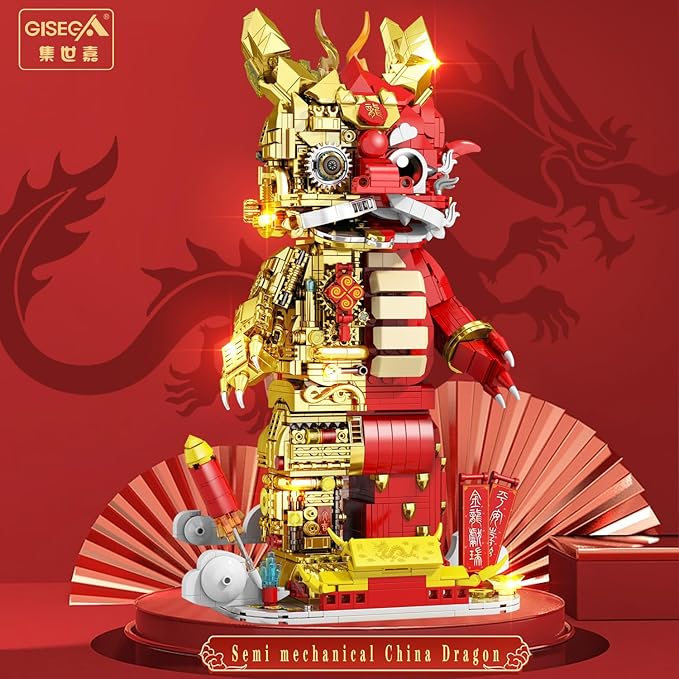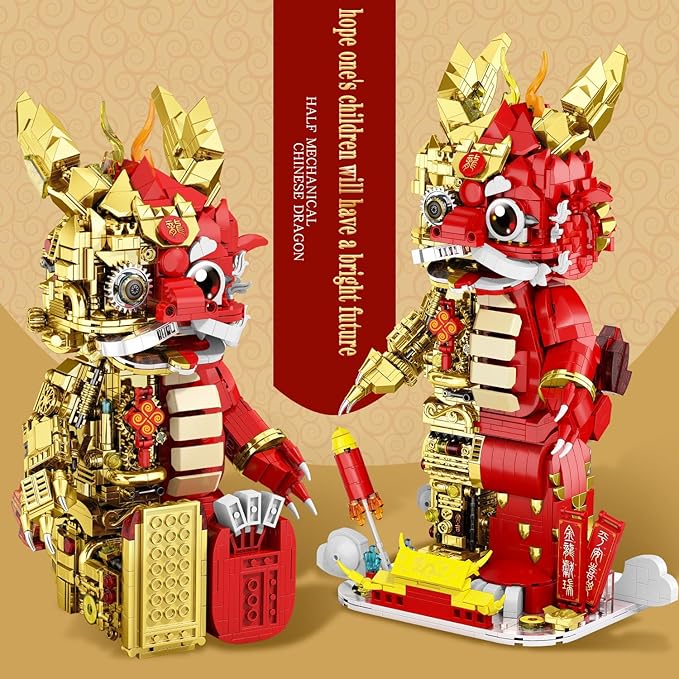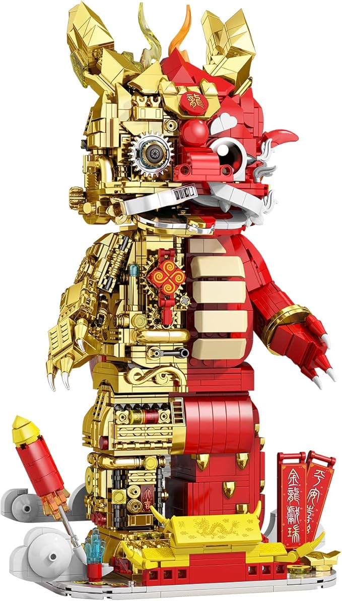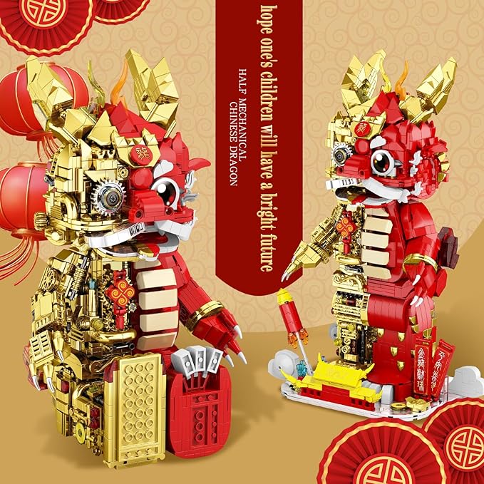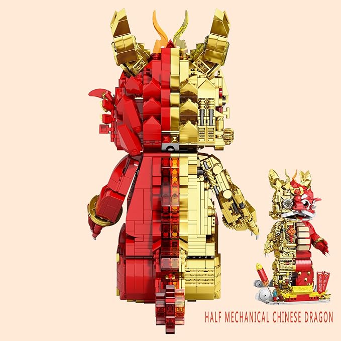 Suitable for Ages 15+ Small Particles (1962 Pieces) Semi Mechanical Chinese Loong Building Block Toys Compatible with Lego Comes with a Transparent Display Box and Building Block Tool Set