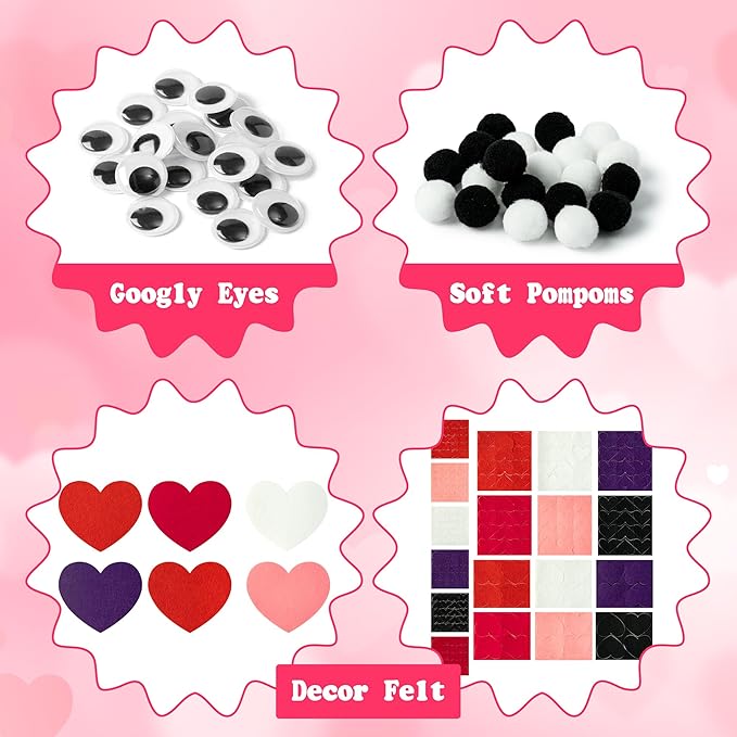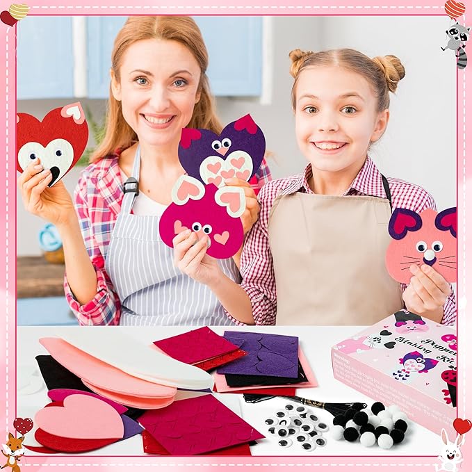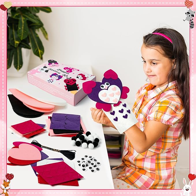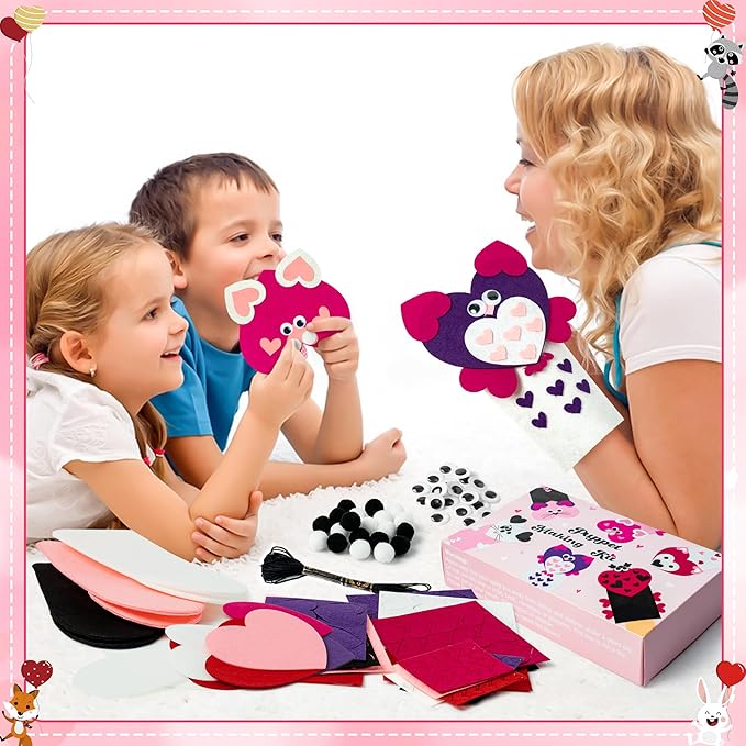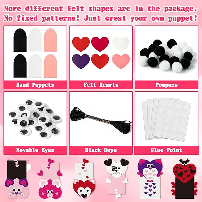 - SUPER KIT - Package comes with 6pcs colorful hand puppets, 26pcs non-cutting felt patterns,1 bundle pompoms, 1 bundle googly eyes, 1 bunch of black rope and a paper box. Create your unique Valentine’s Day heart animals puppet in the world!
