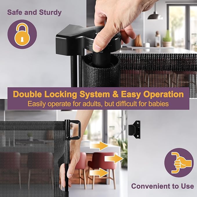 - Suitable for Indoor and Outdoor Wide Openings: Our extra tall and wide retractable baby gate is suitable for indoor open kitchens, bottom of stairs, doorways, hallways and outdoor decks, patios, garages and more.