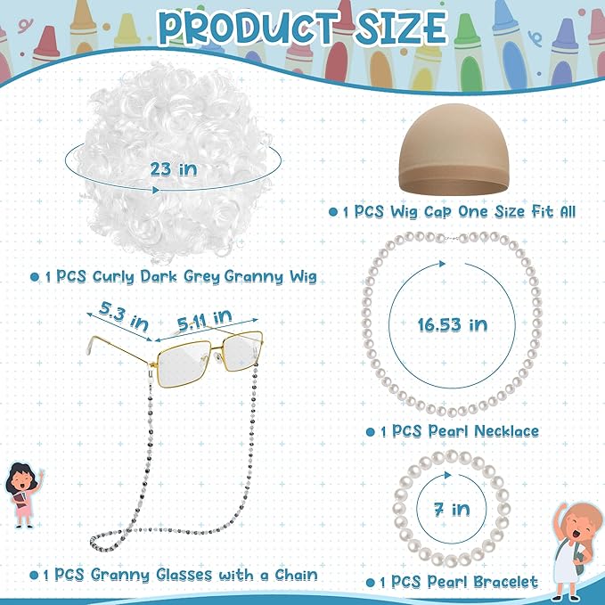 - Cherished Grandma Look: Celebrate the 100th day of school with our 100 day of school costume for girls, featuring a whiter curly wig, granny glasses with a chain, pearl necklace, pearl bracelet, and wig cap for an adorable grandma costume transformation.