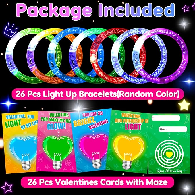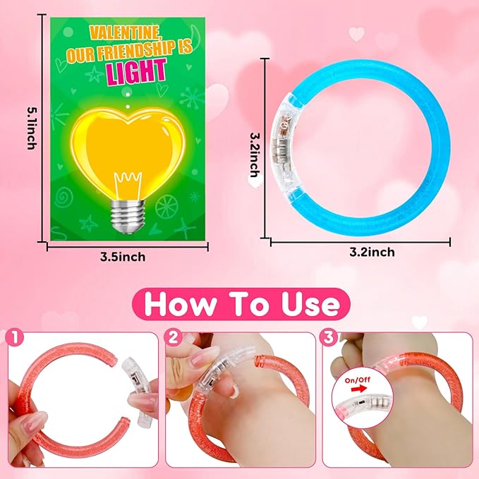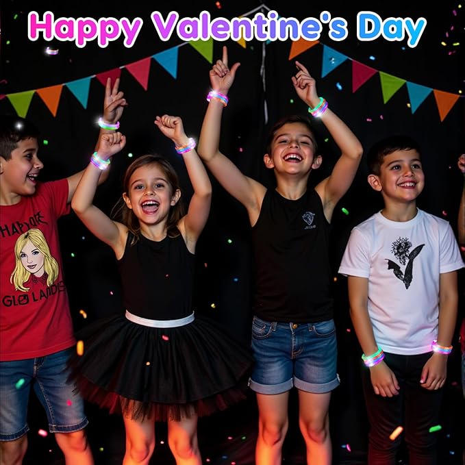 - 【Perfect Valentines Day Glow Party Gift】Exchange fun light up bracelets can be a hit on Valentine’s Day for both boys and girls. Sparkling lights, full of atmosphere, suitable for kids party favors, valentines exchange cards, classroom prizes, school party supplies gifts, valentines treat bags, valentines boxes for kids, party favors for kids 3-5 4-8, goodie bags for birthday party, Glow in the dark LED bracelets.